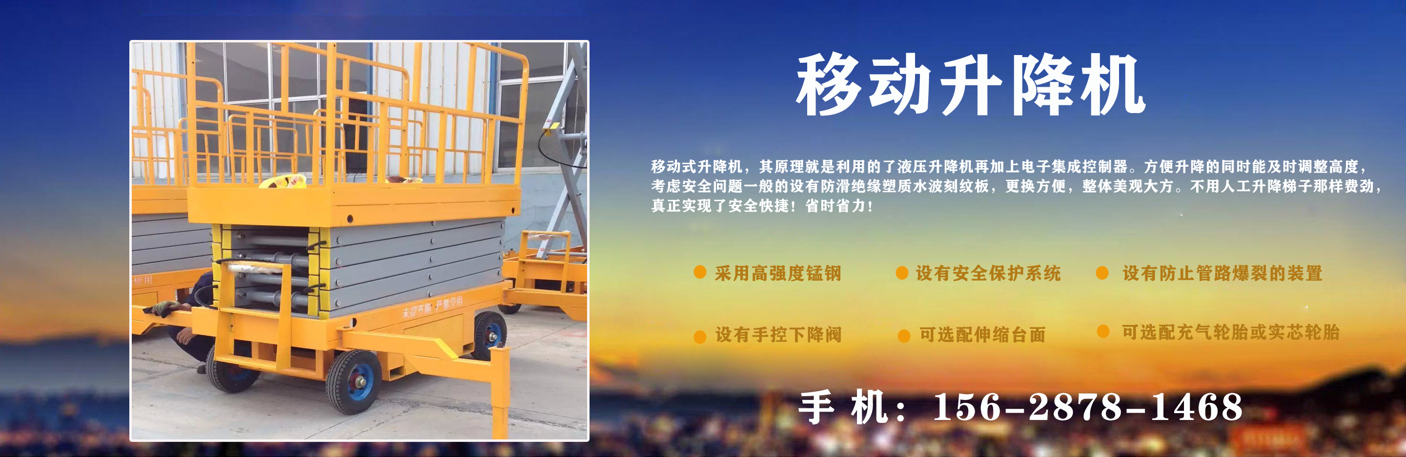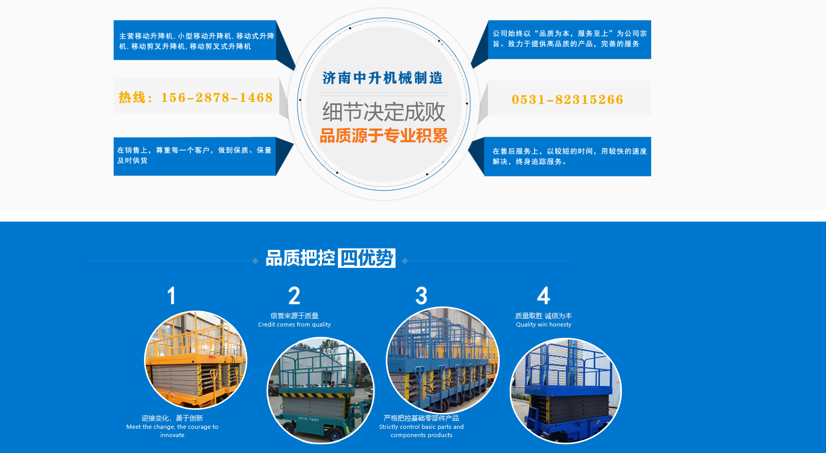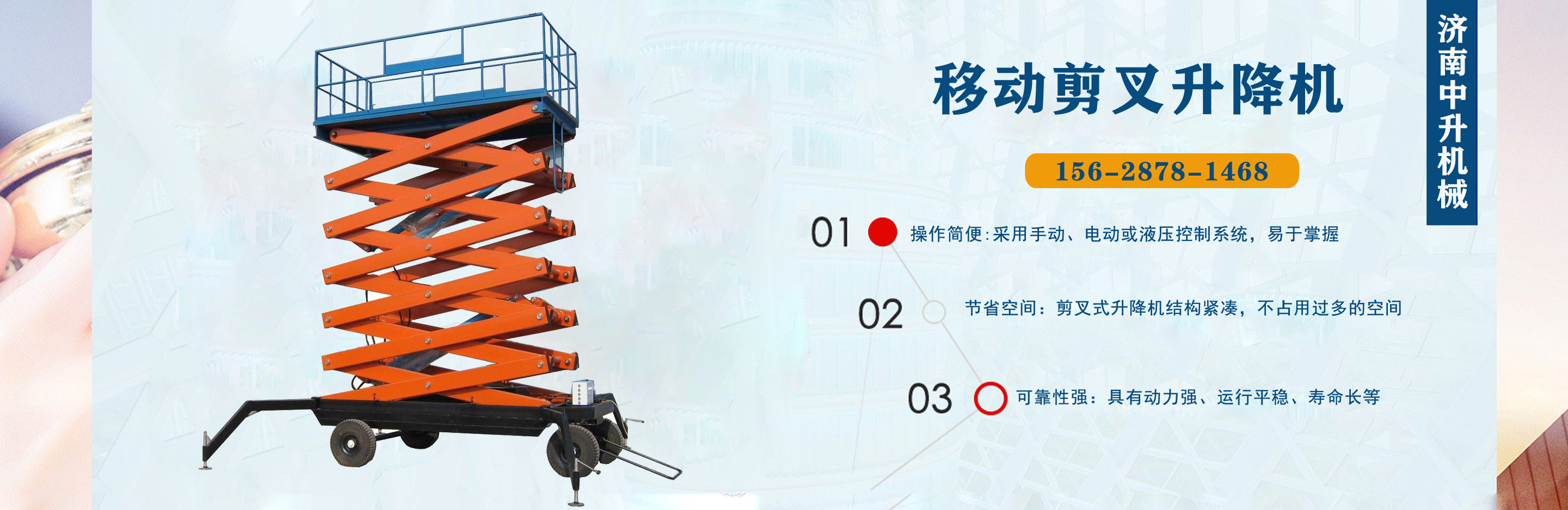 濟南中升機械制造有限公司主營移動升降機,小型移動升降機,移動式升降機,移動剪叉升降機,移動剪叉式升降機等產品,信譽良好,歡迎前來咨詢訂購! 在銷售上,尊重每一個客戶,做到保質、保量及時供貨;在售后服務上,以較短的時間,用較快的速度解決,終身追蹤服務。 公司始終以“品質為本,服務至上”為公司宗旨。致力于提供高品質的產品,完善的服務,快捷的供貨,無論您身處何方,都能感受到我們的優(yōu)良服務。客戶至上,誠信為本。 歡迎各界朋友來電,來函垂詢,選購!...